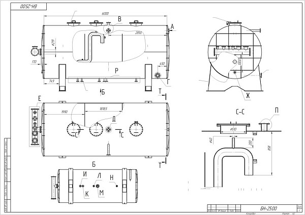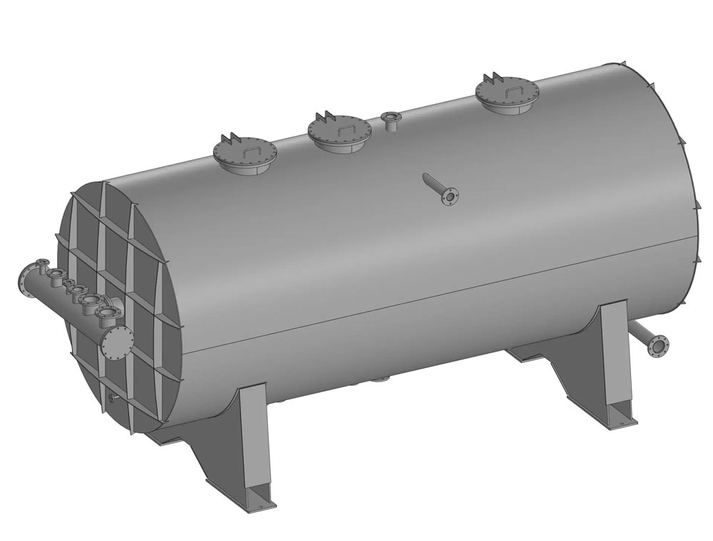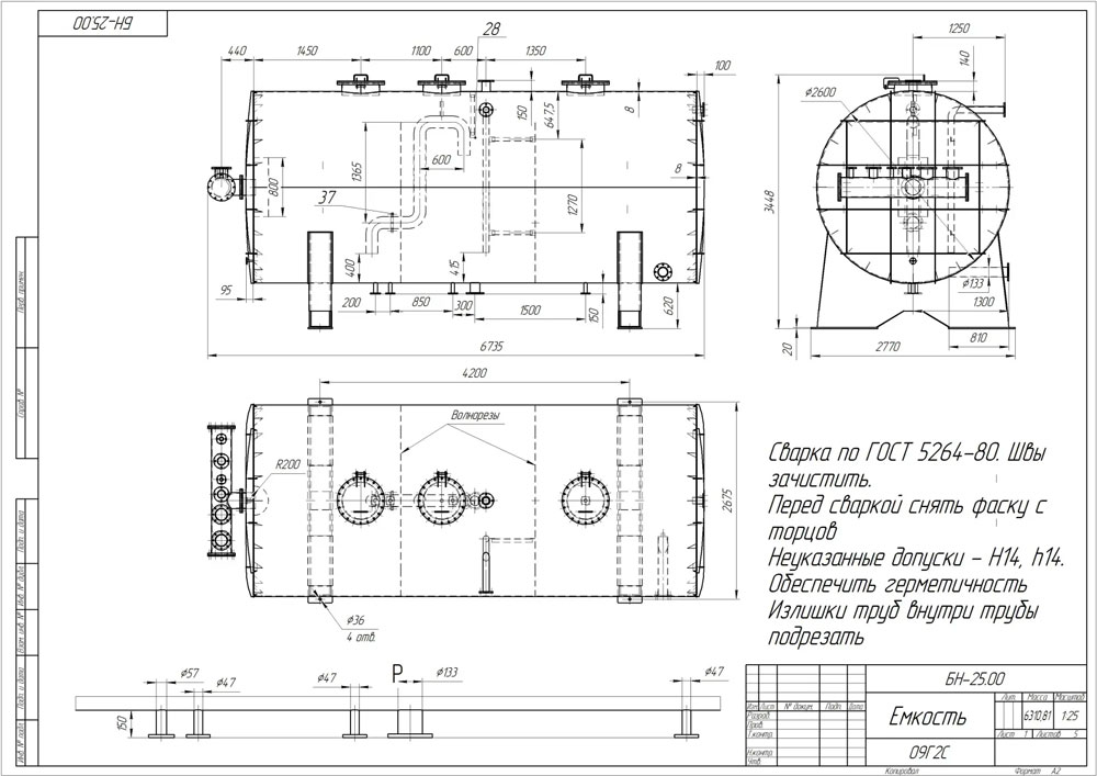 Горизонтальный резервуар представляет собой цилиндрическую емкость с опорными седловыми ложементами. Такое решение обеспечивает равномерное распределение нагрузки и устойчивость при заполнении.